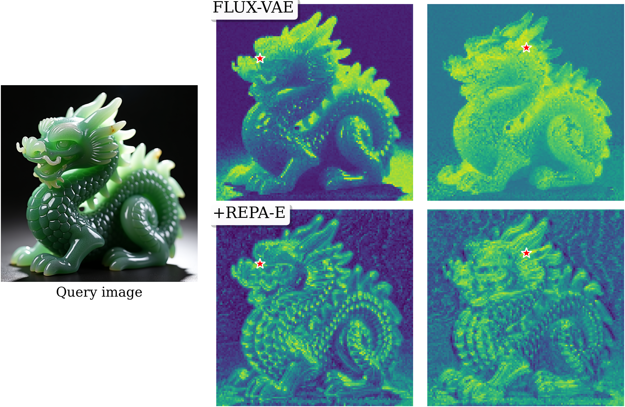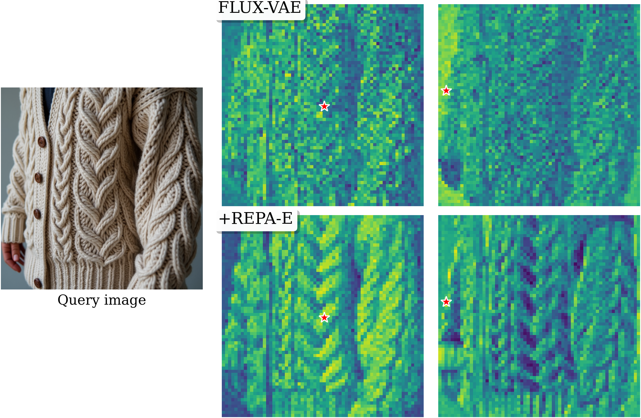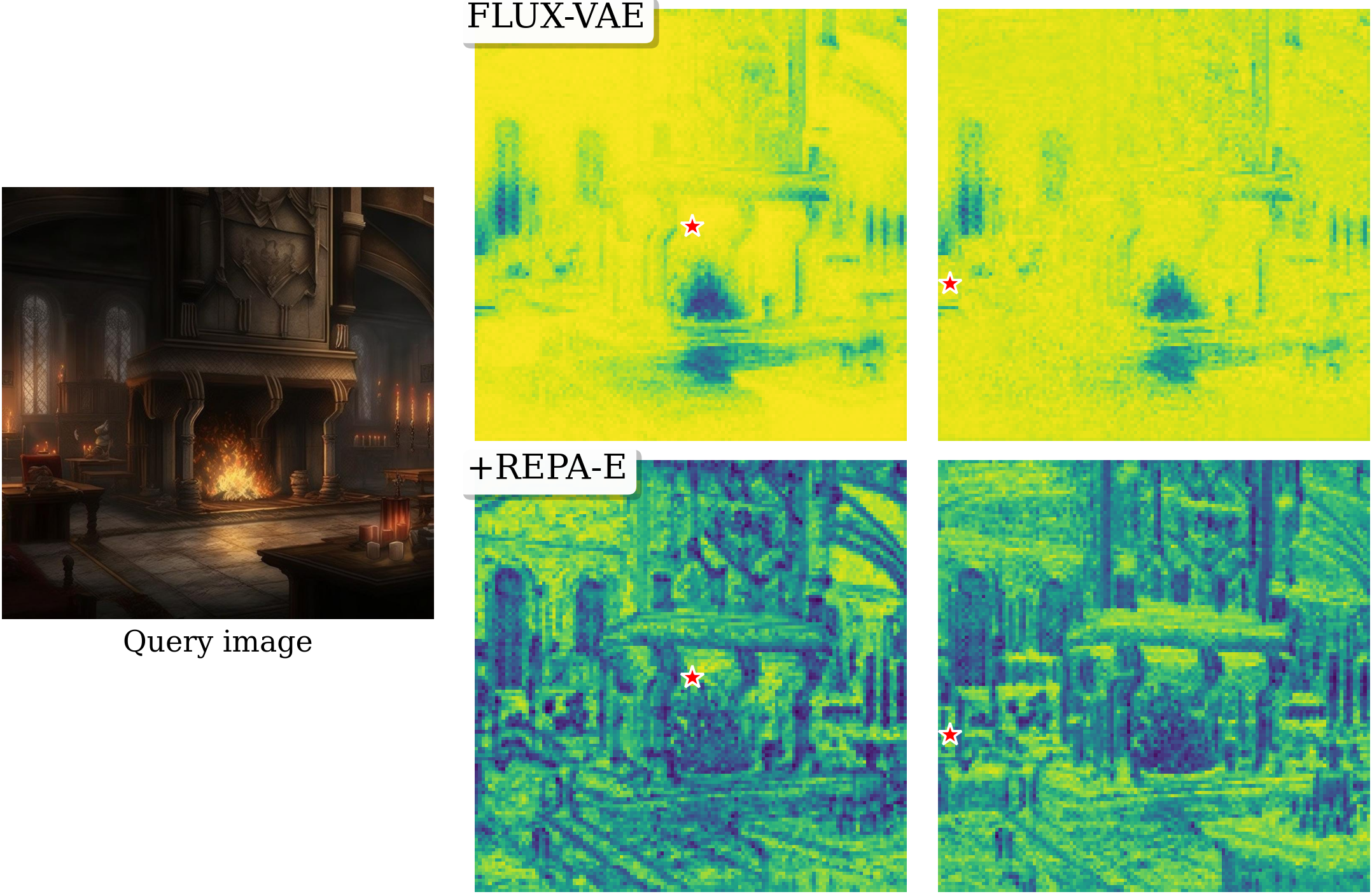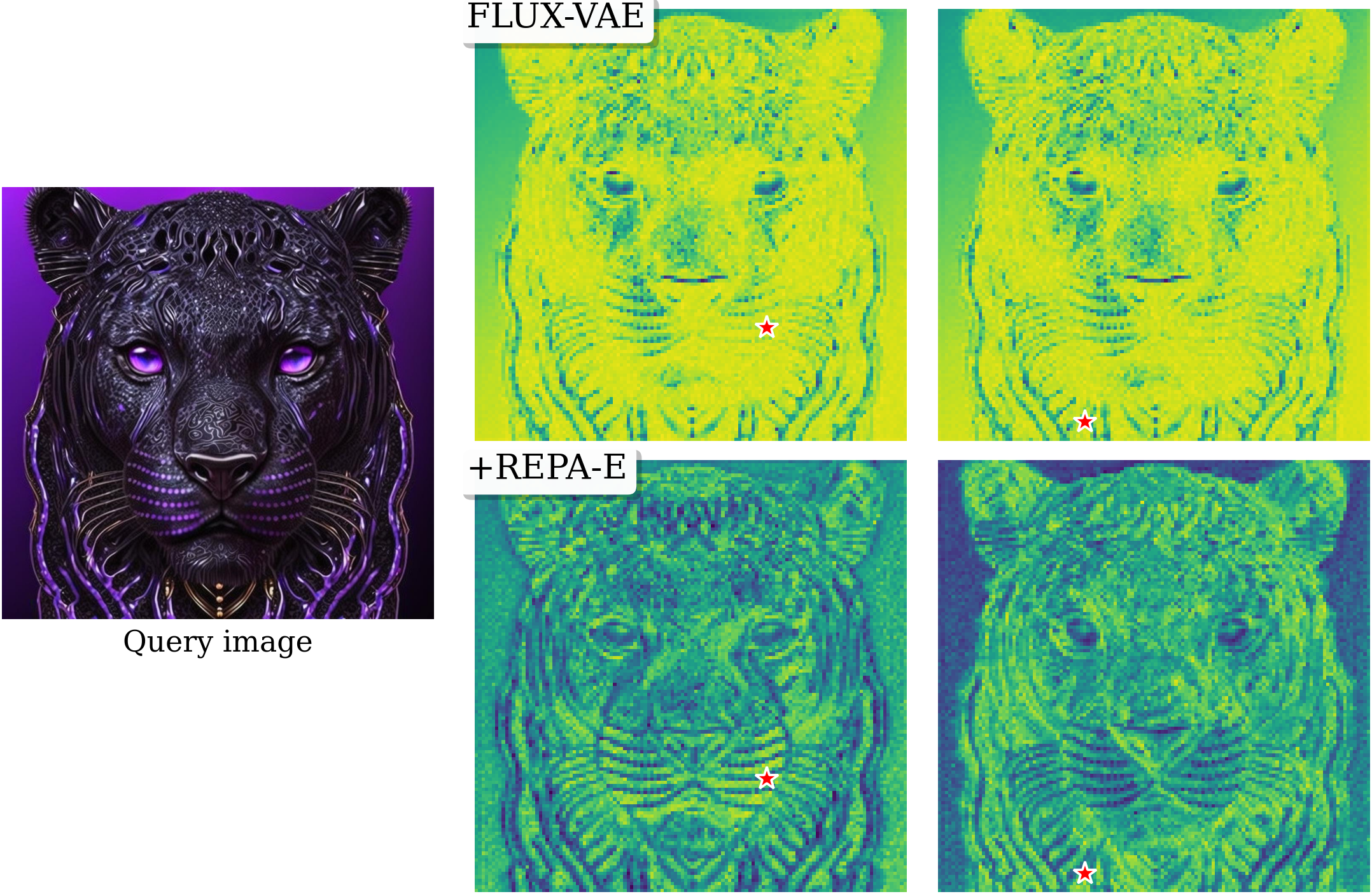 Notably, end-to-end tuning enriches the VAE latent space by incorporating more structural and semantic information over traditional VAEs (Flux-VAE, SDVAE) trained for reconstruction alone. Please also refer the original REPA-E